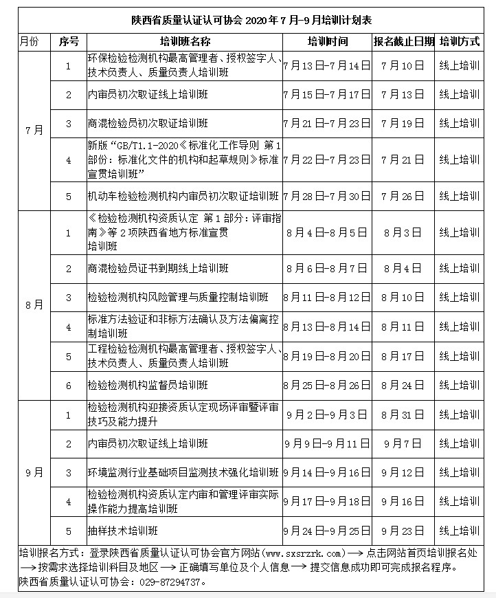 陕西省质量认证认可协会2020年7月-9月培训计划表